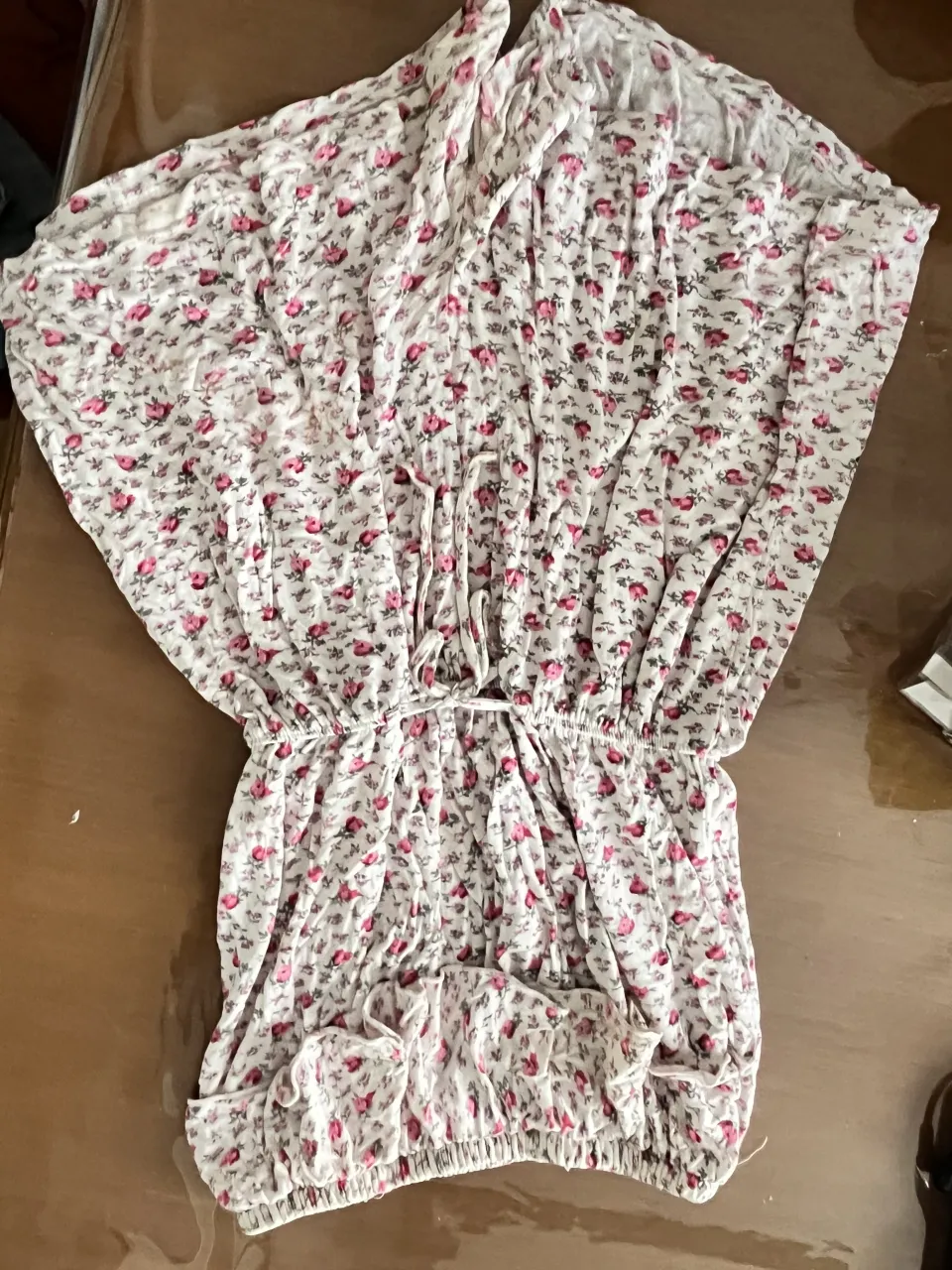 Vestido mono blanco con estampa de flores rosas. Posee cordones para ajustar en la cintura