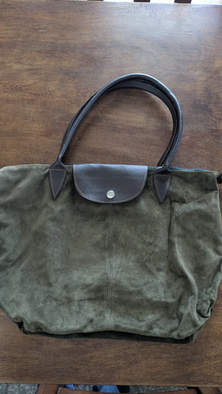 Bolso de gamuza color verde militar con detalles en cuero marrón. Posee manijas cortas y una solapa con broche a presión para cerrar. El interior está forrado y cuenta con bolsillos.