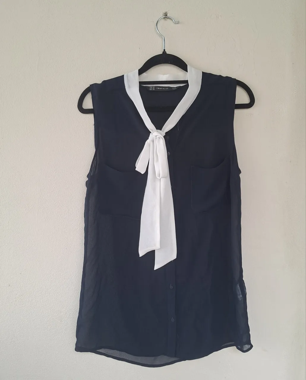 Blusa sin mangas con cuello solapa y detalle de lazo al frente. Ideal para un look elegante y sofisticado.
