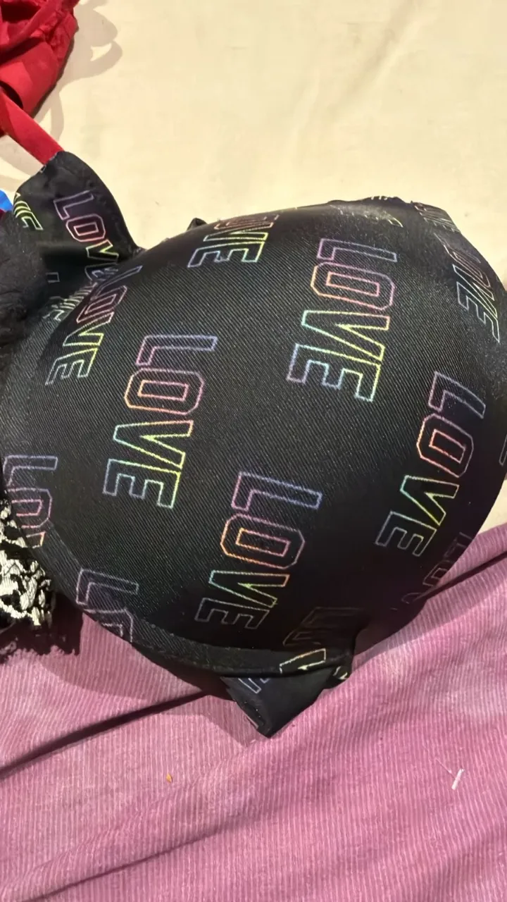 Conjunto de corpiño y bombacha de encaje negro. El corpiño tiene detalles de encaje blanco y elástico negro con la inscripción "LOVE LG". La bombacha es de encaje negro con detalles de encaje blanco.