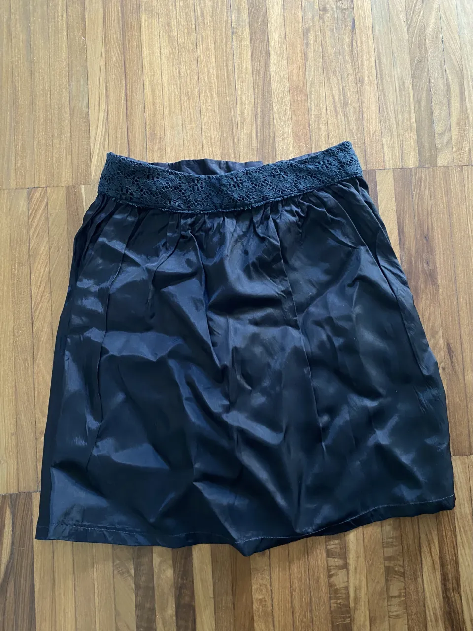 Pollera negra corta tiro alto con cintura de encaje y detalle de botones al frente. Medidas: 27 cms de cintura, 45 cms de cadera, 39 cms de largo