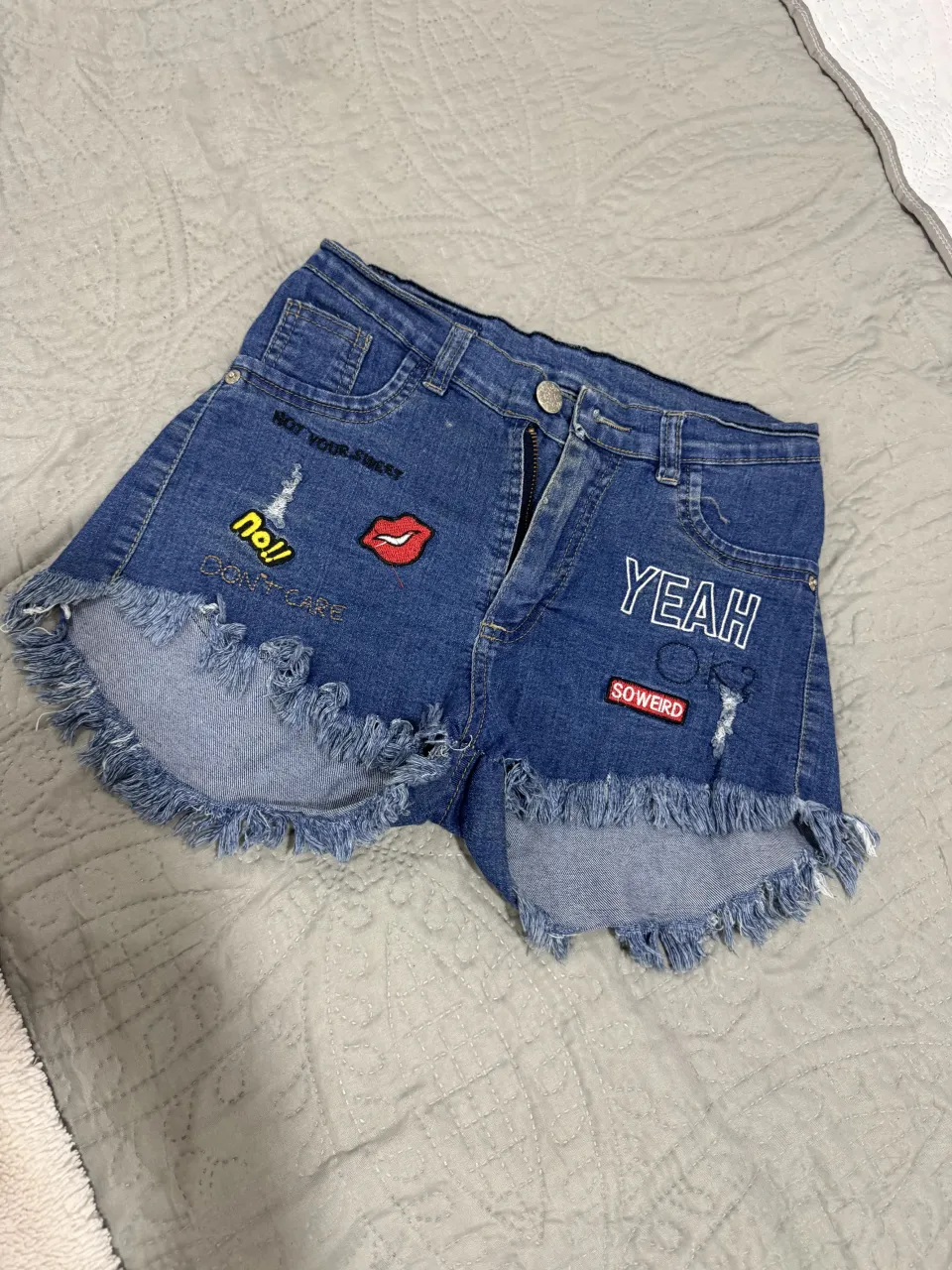 Shorts de jean con roturas y flecos en el ruedo. Tienen apliques de parches con frases y un beso.