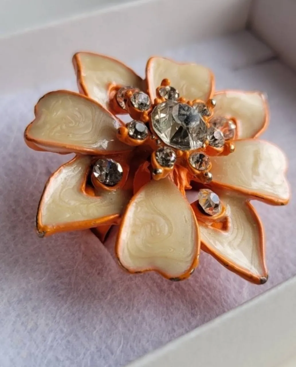 Anillo ajustable con diseño de flor esmaltada en naranja con strass en el centro y con pétalos nacarados en crudo. Por algunas caídas, hay puntas de los pétalos apenas despintadas, lo muestro en fotos, pasan desapercibidas porque el modelo es hermoso y con tonos vibrantes. Ideal para resaltar cualquier look de noche o fiesta.