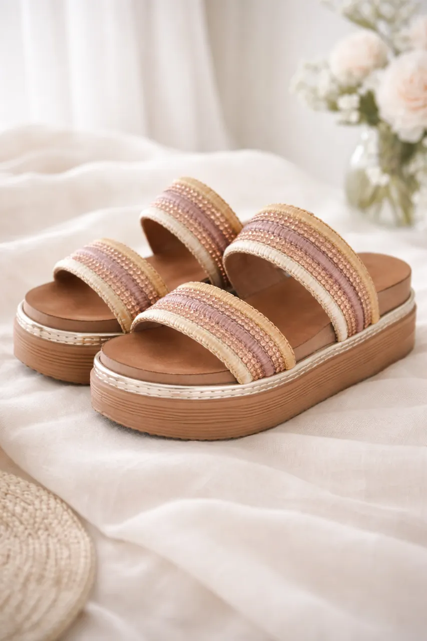 Sandalias de plataforma con tiras adornadas con pedrería y detalles en dorado y rosa. Perfectas para un look veraniego y chic.