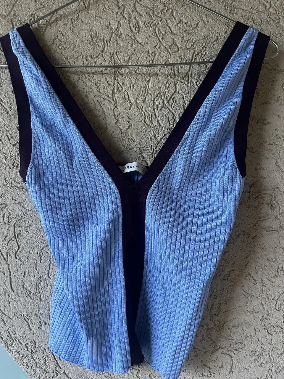 Top ZARA de tejido acanalado en color celeste con detalles en morado. Diseño de escote en V pronunciado y sin mangas. Ideal para un look casual y moderno.