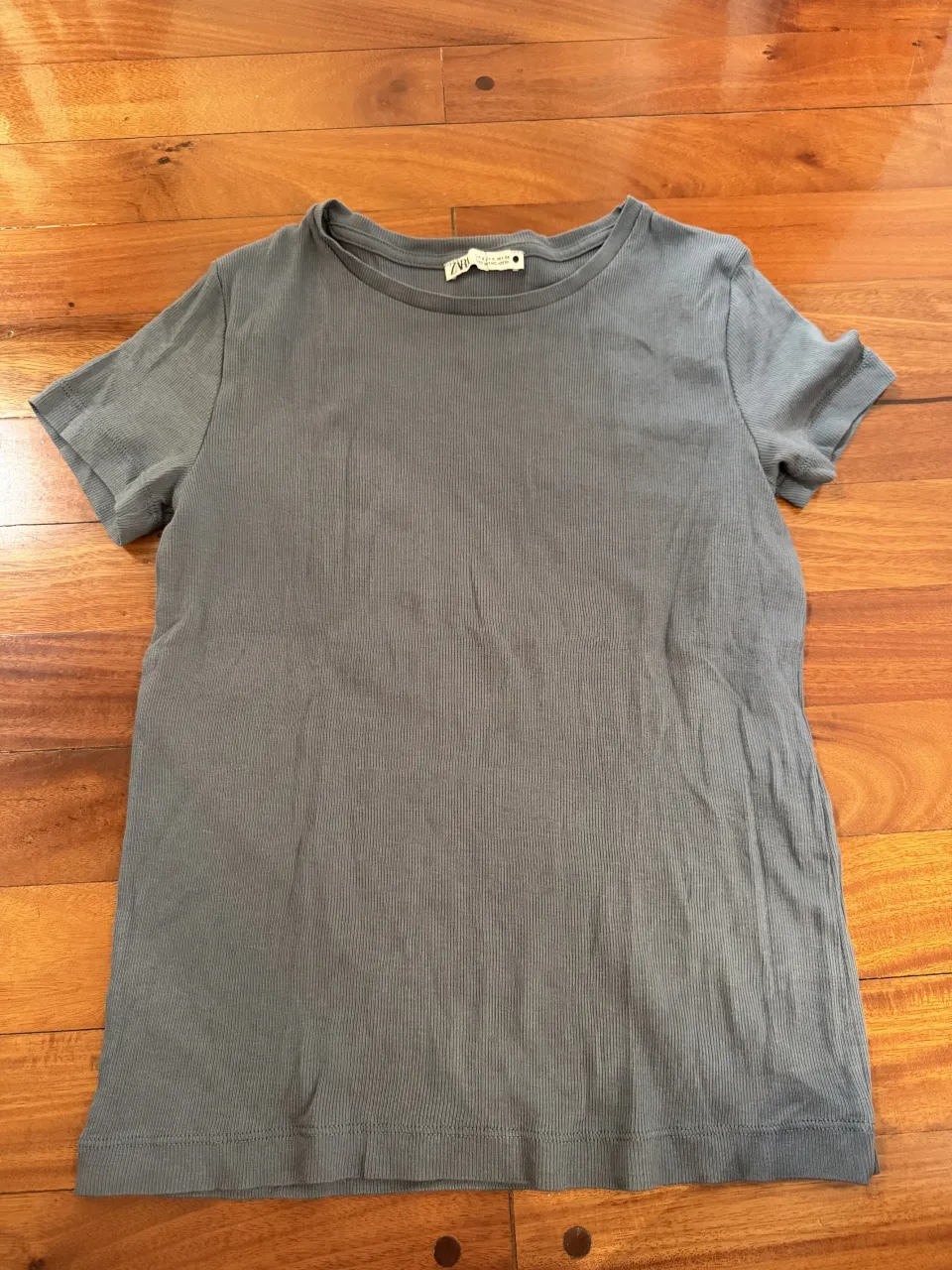Remera gris de algodón acanalado, con cuello redondo y mangas cortas. Perfecta para el día a día, súper cómoda y versátil.