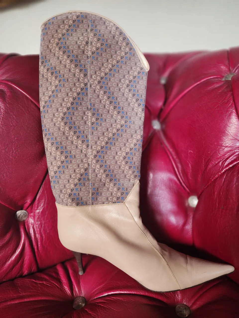 Botas de caña alta con un diseño exclusivo y elegante. Interior forrado en nude. La parte superior presenta un estampado repetitivo de la marca 'CAPRICCI en tonos beige, azul y negro, que le da un toque distintivo. La parte inferior es color nude, con un taco fino de 8cm. y punta fina. Ideales para elevar cualquier look. Talla 39 Eu equivale a 39 Argentina