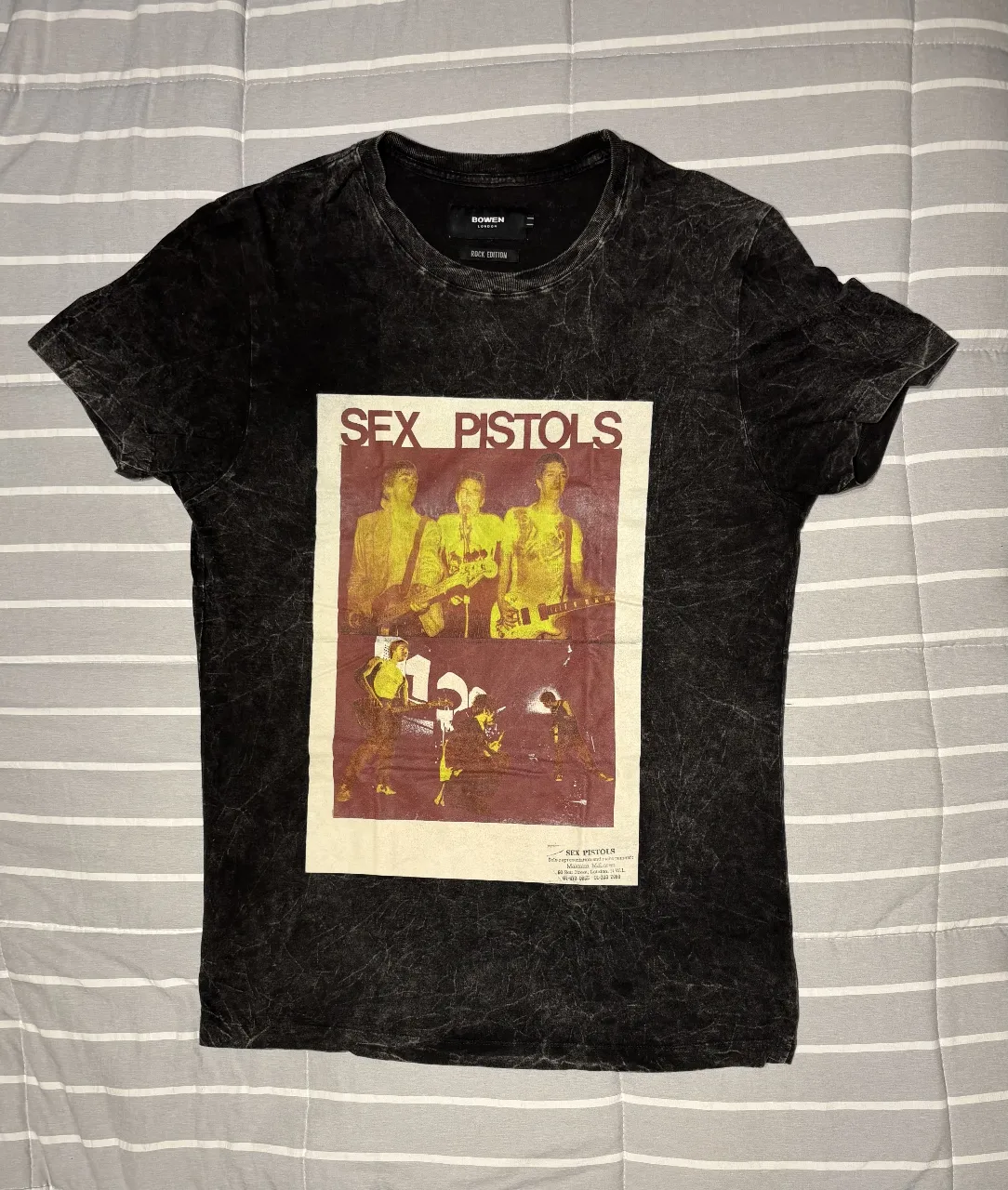 Remera Bowen negra con estampa de Sex Pistols, estilo vintage. Ideal para un look rocker y urbano. Talle S Hombros: 45cm Pecho: 51cm Manga: 21cm Largo: 75cm