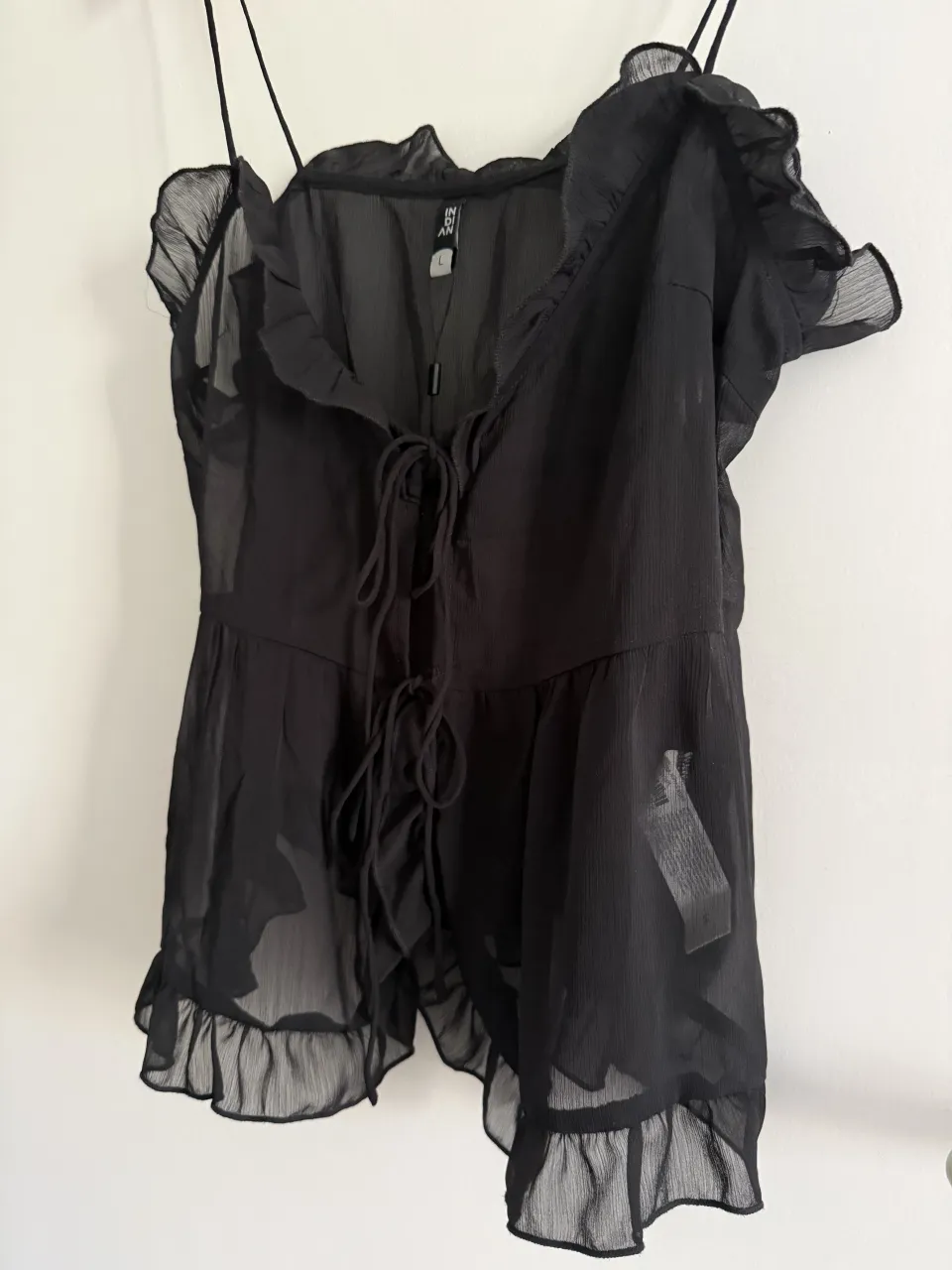 Top negro con volados y lazo en el escote. Ideal para un look canchero y femenino.