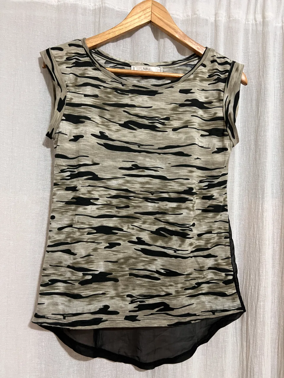 Remera estampada con diseño camuflado en tonos tierra y negro. Posee un detalle de tela transparente en la parte inferior, dándole un toque moderno y canchero. Ideal para un look casual y descontracturado.