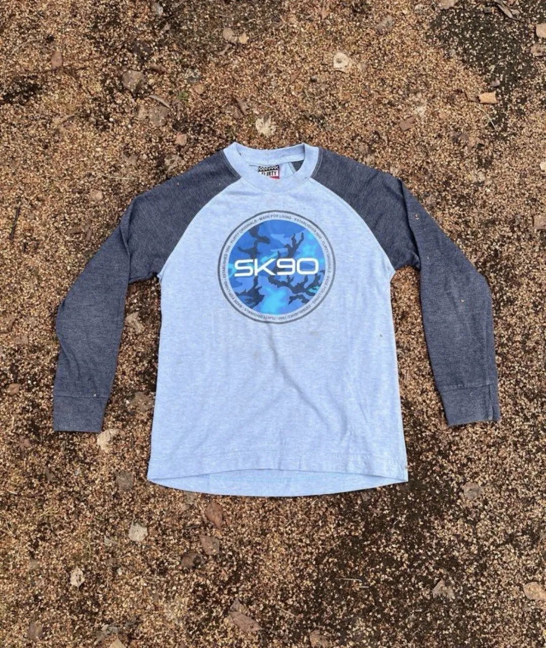 Remera manga larga de algodón, con mangas de color gris oscuro y cuerpo de color celeste. En el frente tiene un estampado circular con el texto "SK90" y un diseño de camuflaje azul. Talle 28 (Niño)