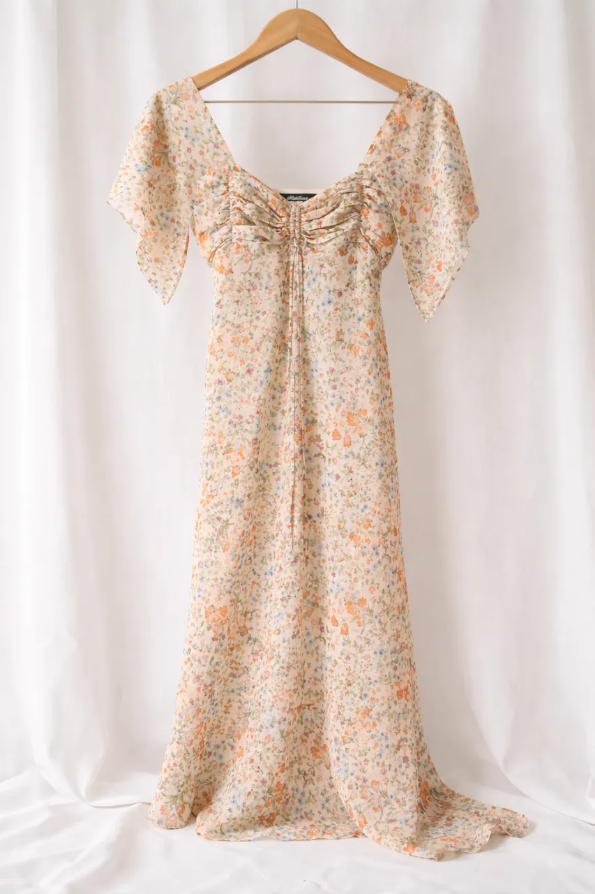 Vestido largo floral con escote fruncido y mangas acampanadas. Un modelo romántico y delicado, perfecto para un look de día o una salida especial. Su estampado vibrante le da un toque alegre y femenino.