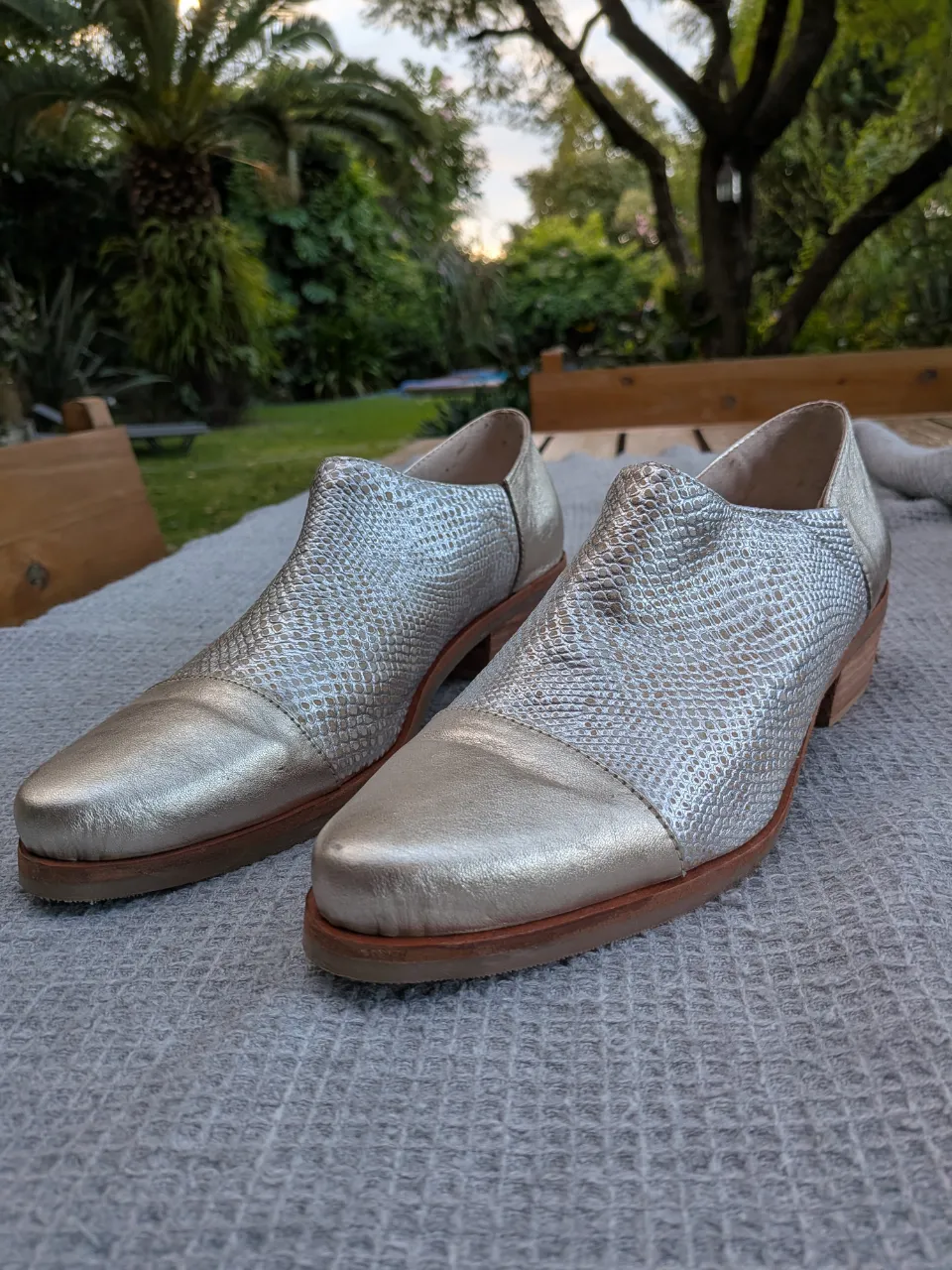 Zapatos bajos plateados y dorados con textura de escamas y puntera lisa. Taco bajo de madera.