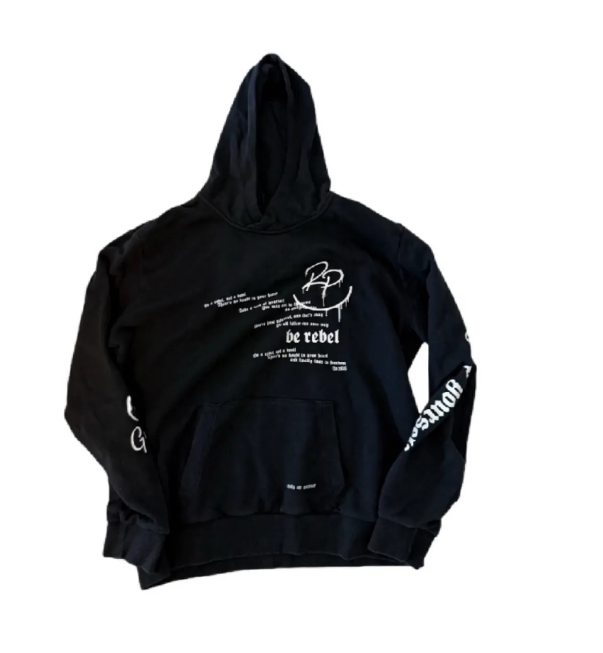 Buzo negro con capucha y estampa "be rebel" en el frente. Diseño oversize con detalles de texto en mangas y frente. Ideal para un look urbano y canchero.