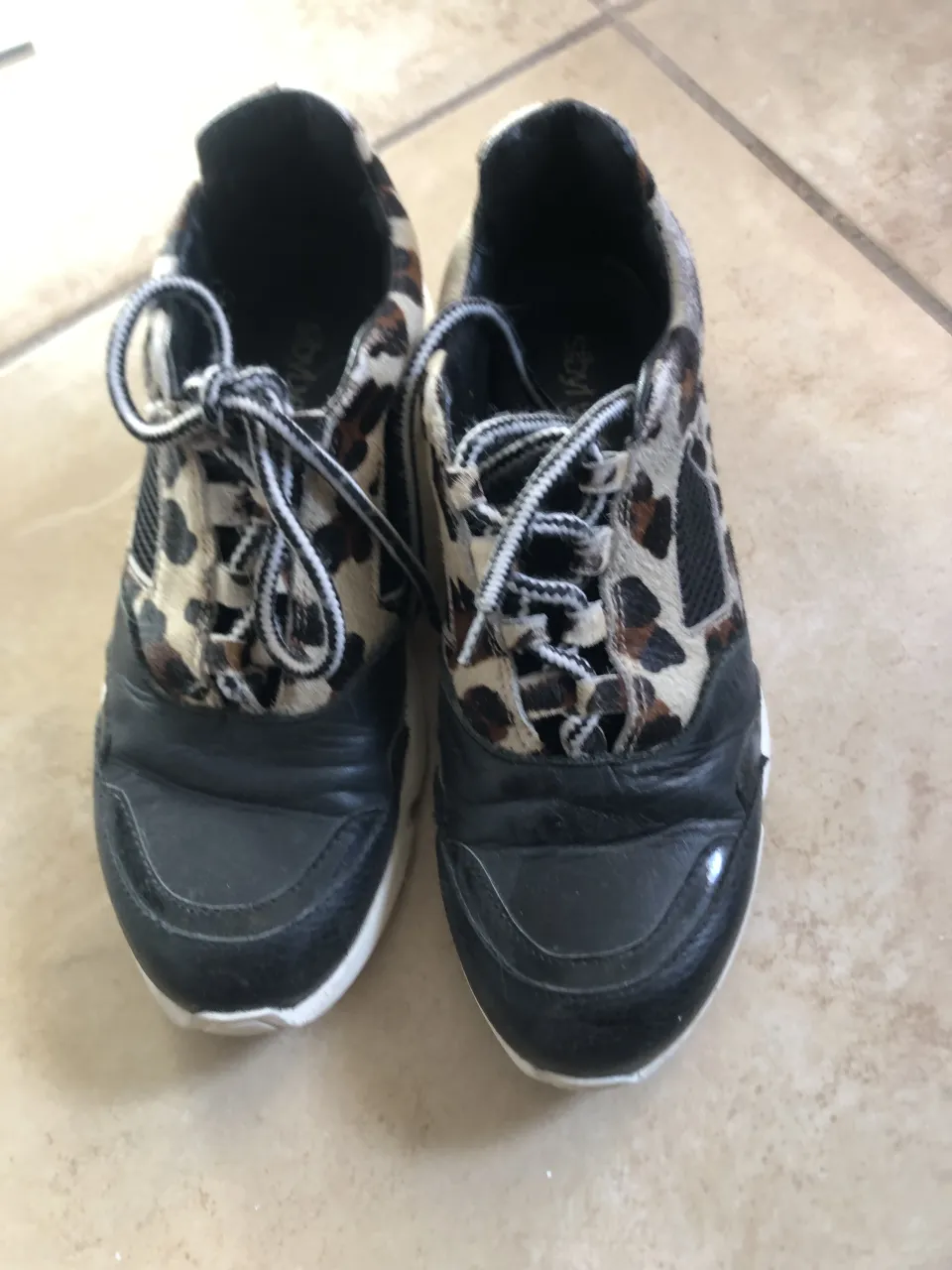 Zapatillas con estampado de leopardo y detalles en negro. Cordones blancos y negros.