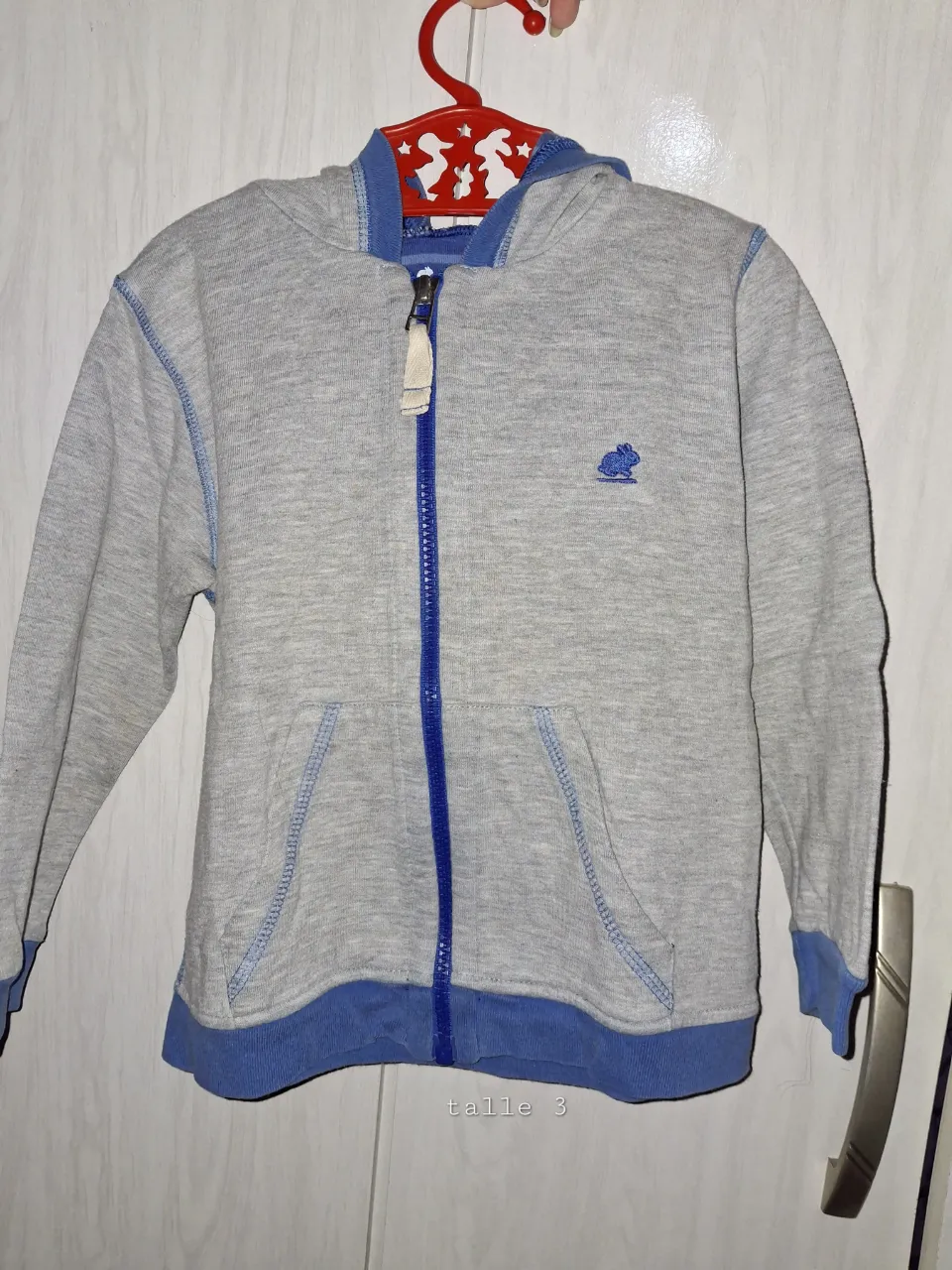 Buzo gris con capucha y cierre completo. Posee detalles en azul en el cuello, puños y cintura. Tiene un bordado de un conejo azul en el frente.