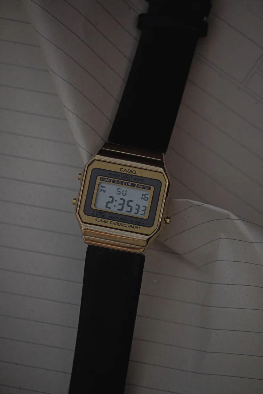 Reloj Casio dorado con malla negra. Modelo A91W.