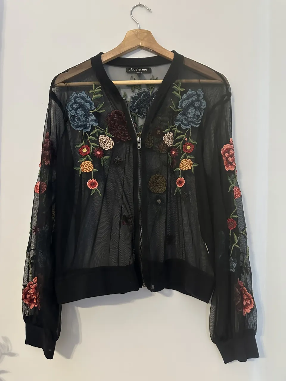 Campera bomber de red negra con bordados florales súper delicados y coloridos. Un diseño único y llamativo, ideal para darle un toque especial a cualquier outfit. Es liviana y transparente, perfecta para usar sobre tops o remeras.