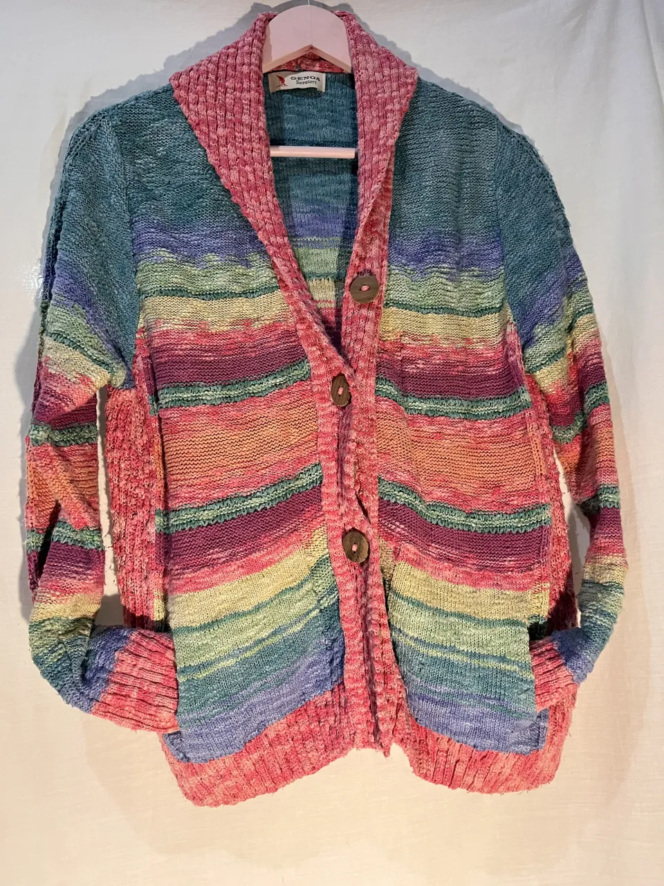 Cardigan saco tejido en telar a rayas multicolor con cuello solapa y botones de madera. Posee bolsillos frontales. abrigado