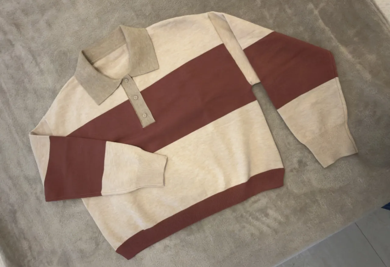 Remera de manga larga con cuello polo y botones. Diseño a rayas en tonos tierra, ideal para un look casual y cómodo.
