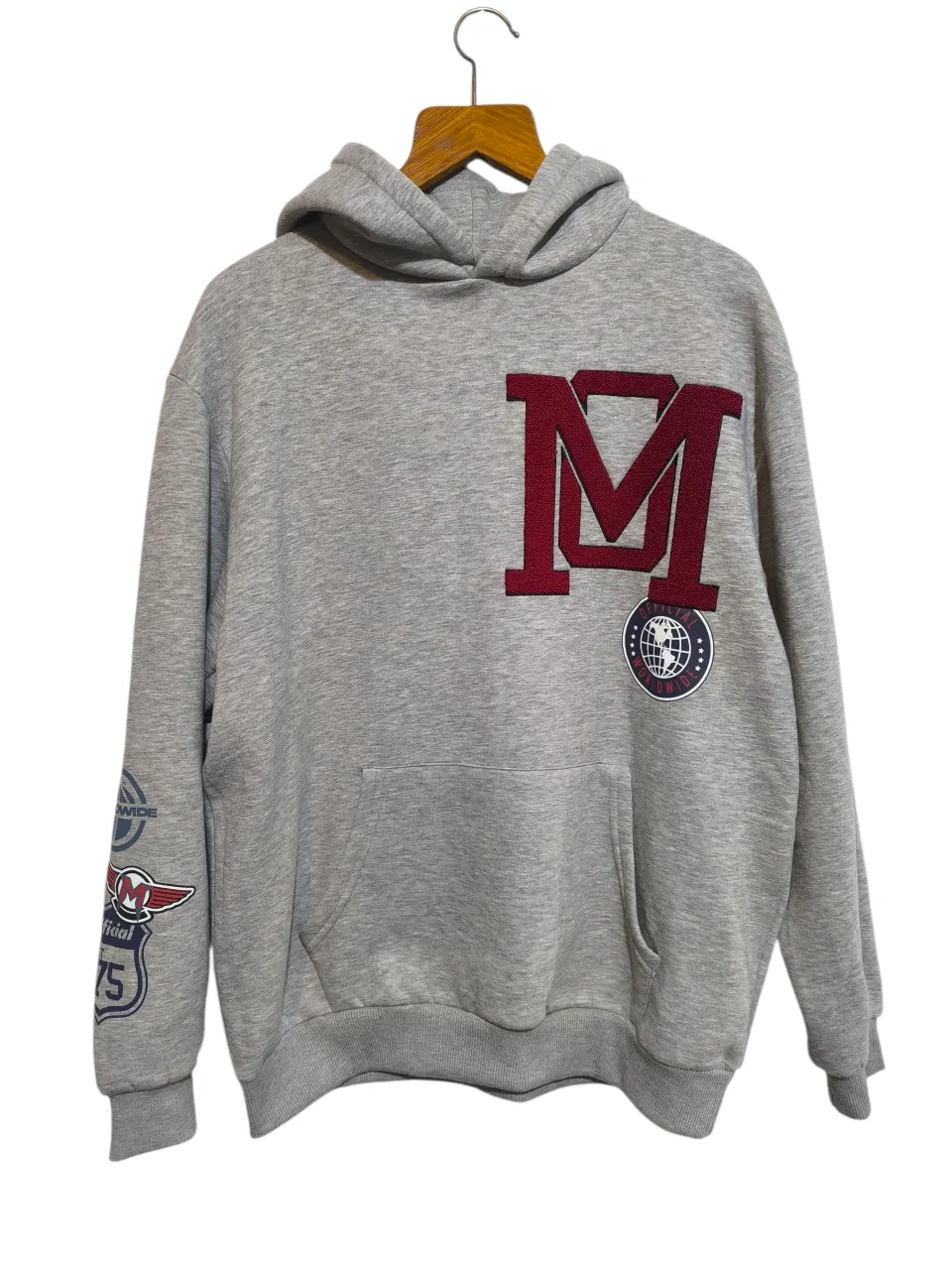 Buzo gris con capucha y estampa de letras 'M' en rojo y apliques de globos terráqueos. Ideal para un look urbano y canchero. Medidas: Largo 73 cm - Ancho 65 cm.