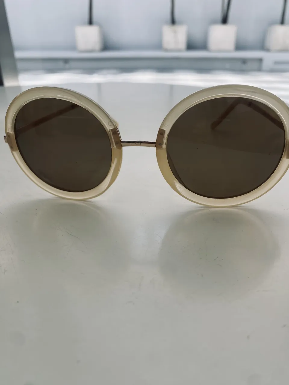 Anteojos de sol con armazón redondo de color crudo y lentes oscuros. Las patillas son finas y metálicas. solo tiene un poco desgastadas las patillas