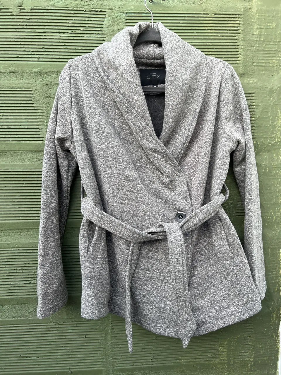 Campera gris jaspeado con cuello solapa y cinturón de tela para atar.