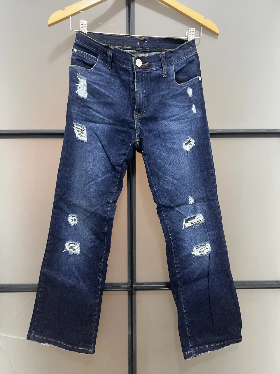 Jeans de mujer Desiderata, tiro medio, con roturas y detalles desgastados. Talle 24.