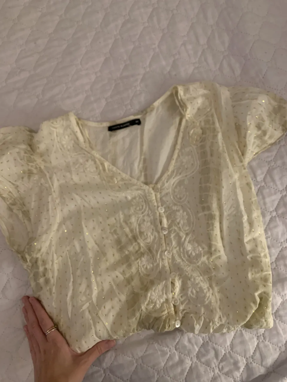 Blusa de seda color crema con detalles bordados y brillos dorados. Posee botones al frente y mangas cortas. Ideal para un look delicado y femenino.