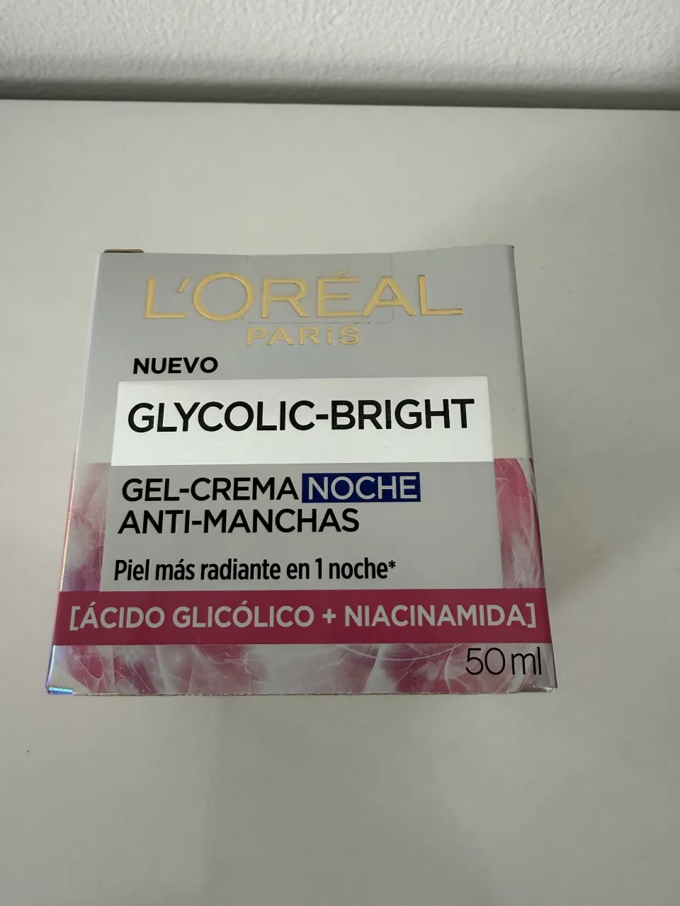 Crema de noche L'Oréal Paris Glycolic-Bright anti-manchas con ácido glicólico y niacinamida. Ayuda a unificar el tono y reducir manchas. Envase de 50ml.