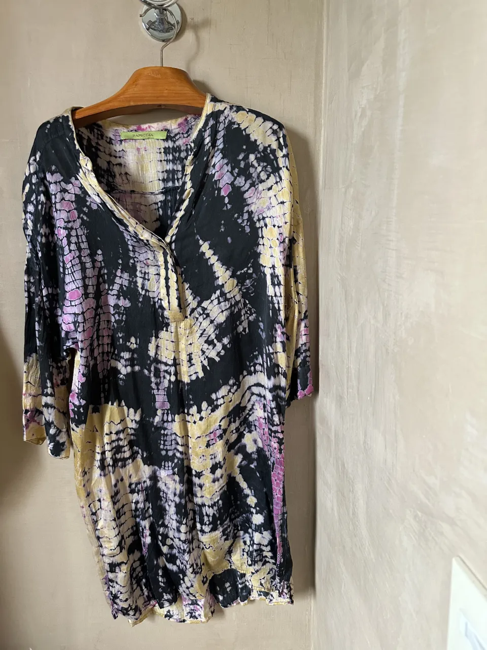 vestido corto estampado con diseño tie-dye en tonos negro, amarillo, rosa y blanco. Posee cuello en V con botones.