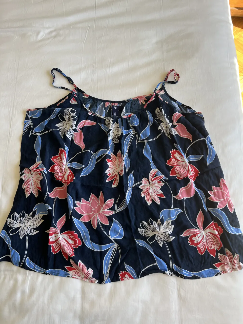 Musculosa/blusa estampada con flores en tonos azules, rosas y rojos. Ideal para un look fresco y casual de verano.