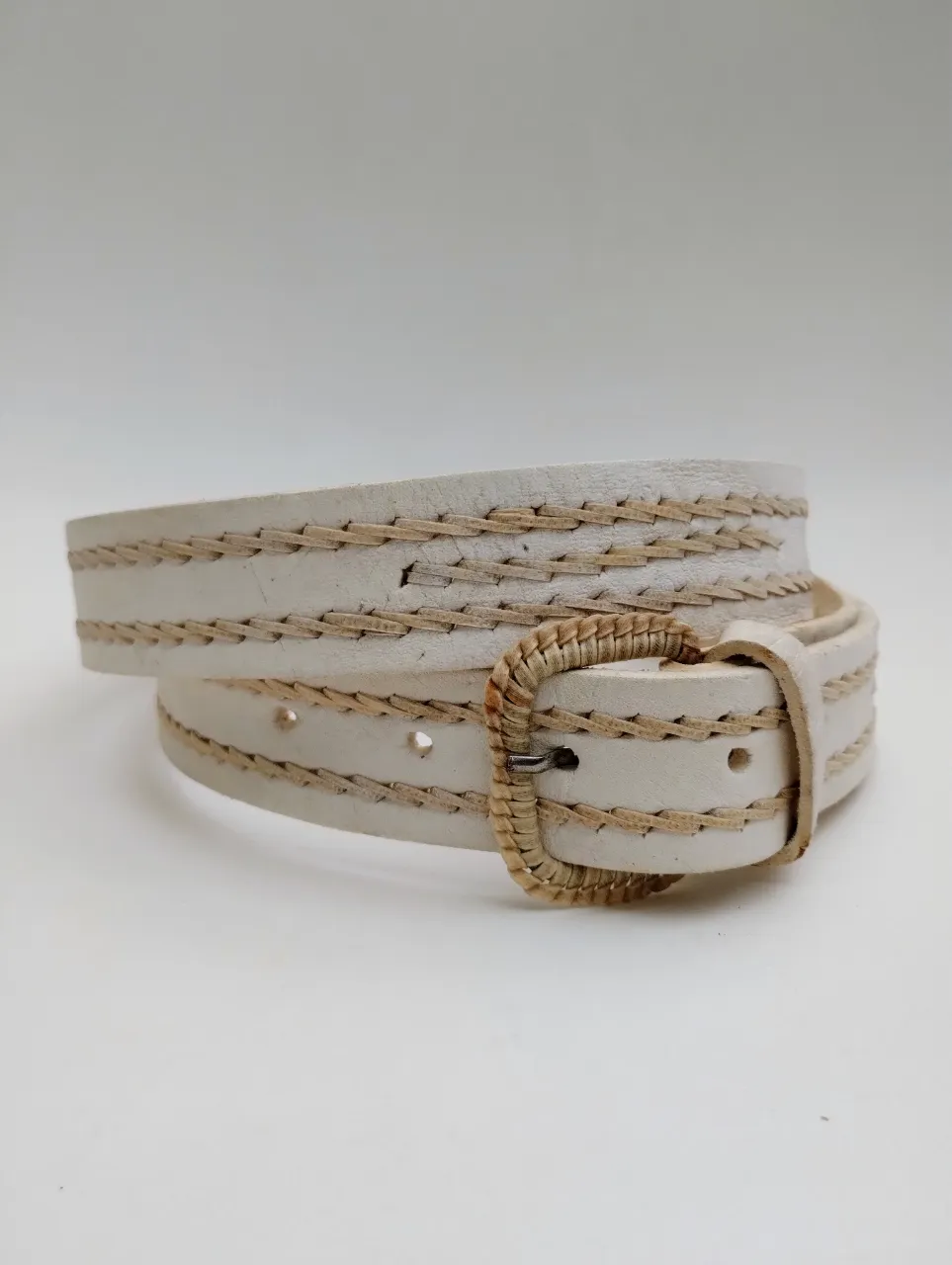Cinturón de cuero crudo. Mide 122 cm de largo (incluida la hebilla) y 3 cm de ancho.