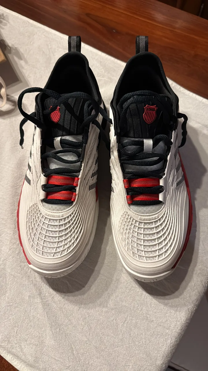 Zapatillas K-Swiss Hypercourt Supreme 2, ideales para tenis. Diseño moderno en blanco y negro con detalles en rojo. Perfectas para un rendimiento óptimo en la cancha.