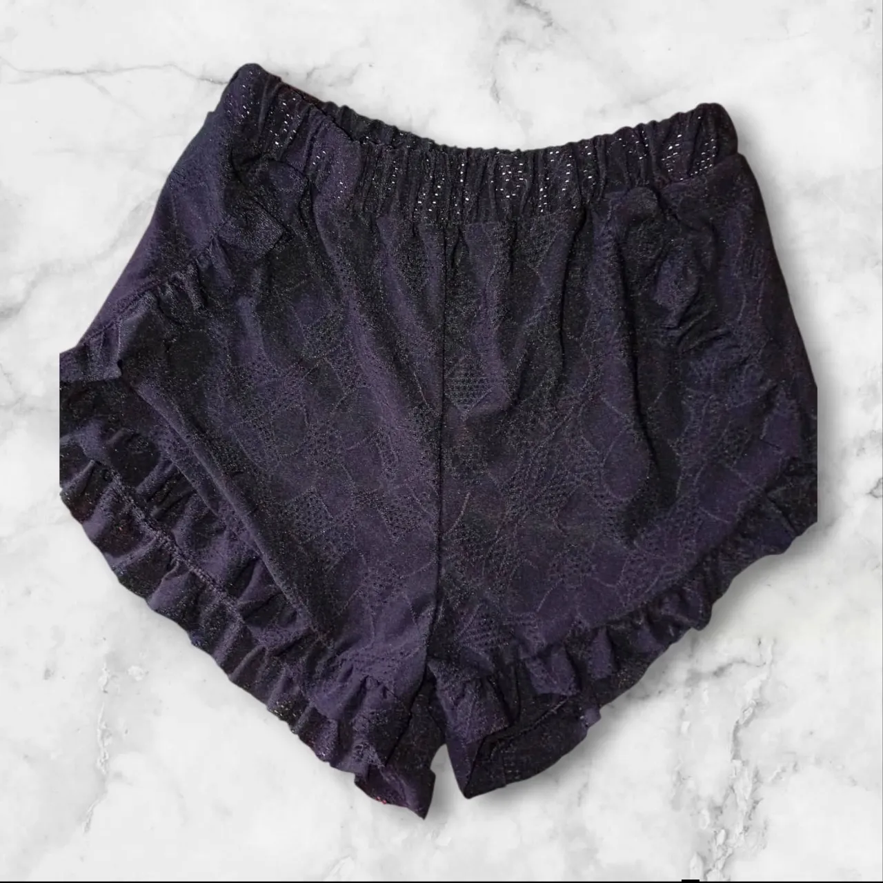 Shorts de encaje negro con volados y cintura elastizada. Perfectos para un look coqueto y femenino.no trasluce porque lleva otra tela por dentro.