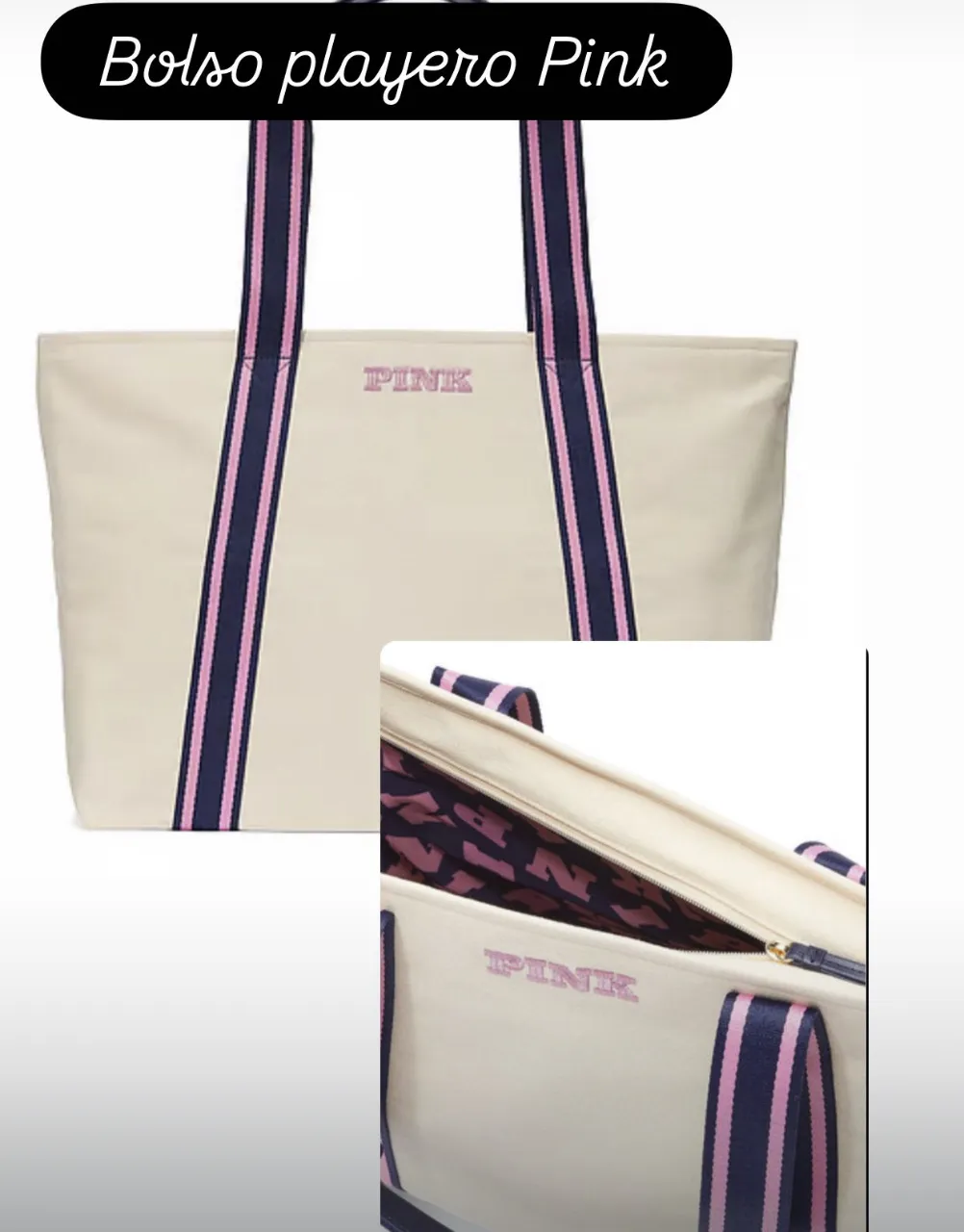 Bolso playero tote bag de lona color crudo, con detalles de tiras en azul marino y rosa. Ideal para llevar todo a la playa o para el día a día. Estampado 'PINK' en el frente. Cierre superior.