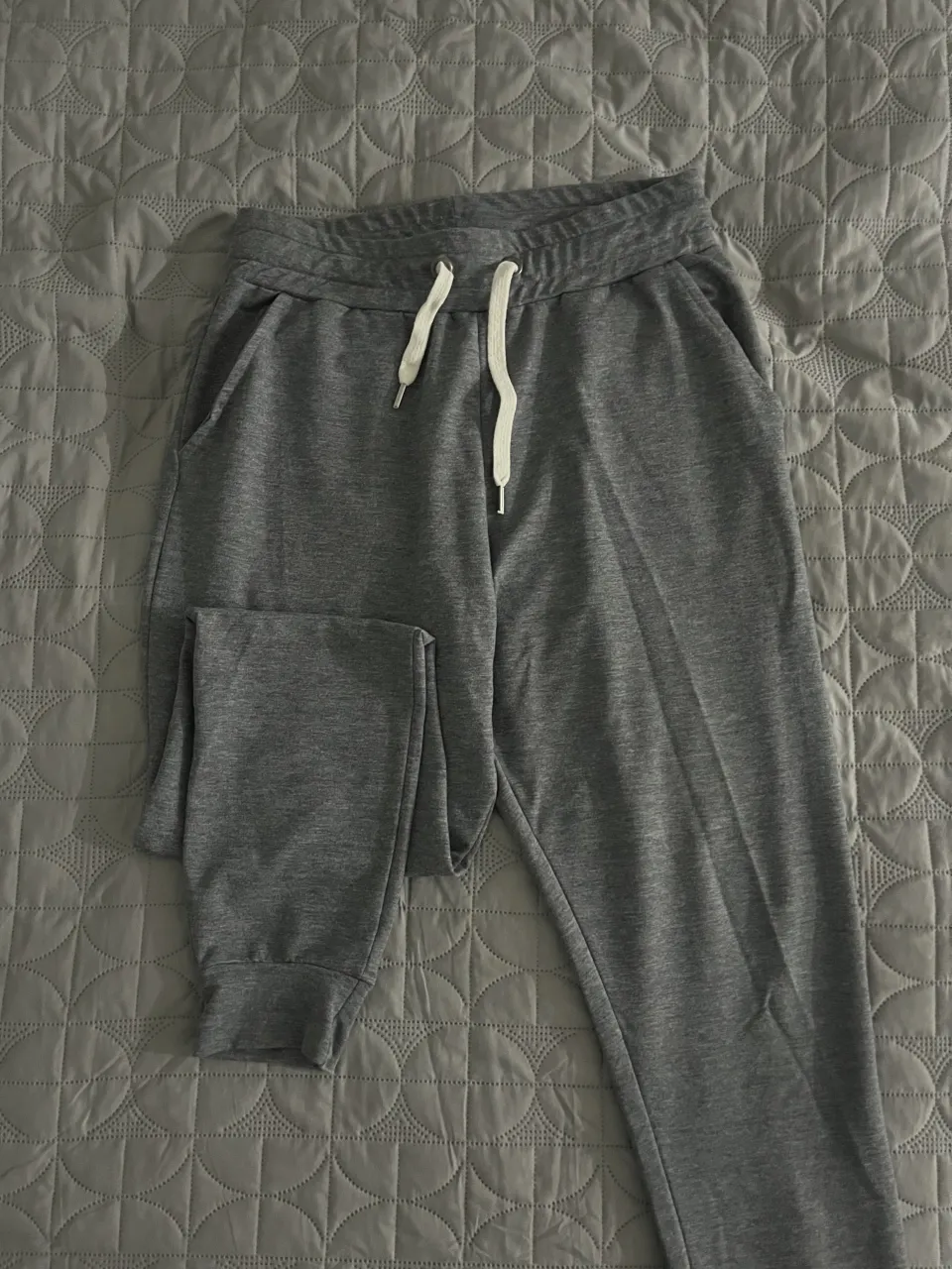Pantalón de jogging gris con cordón blanco en la cintura y bolsillos laterales.