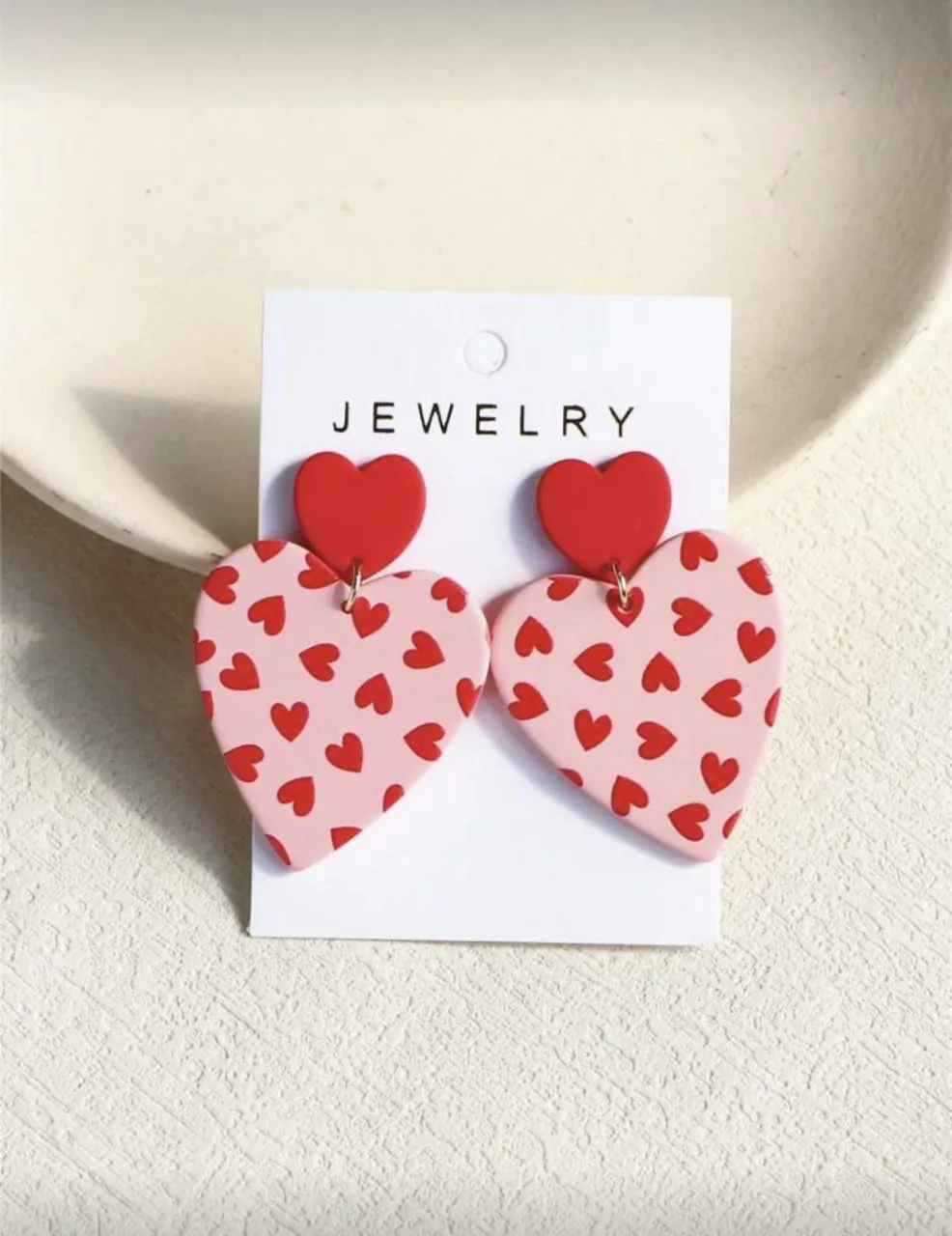 Aros colgantes con forma de corazón, uno más grande que el otro. El corazón grande es rosa pálido con pequeños corazones rojos estampados. El corazón pequeño superior es rojo liso.