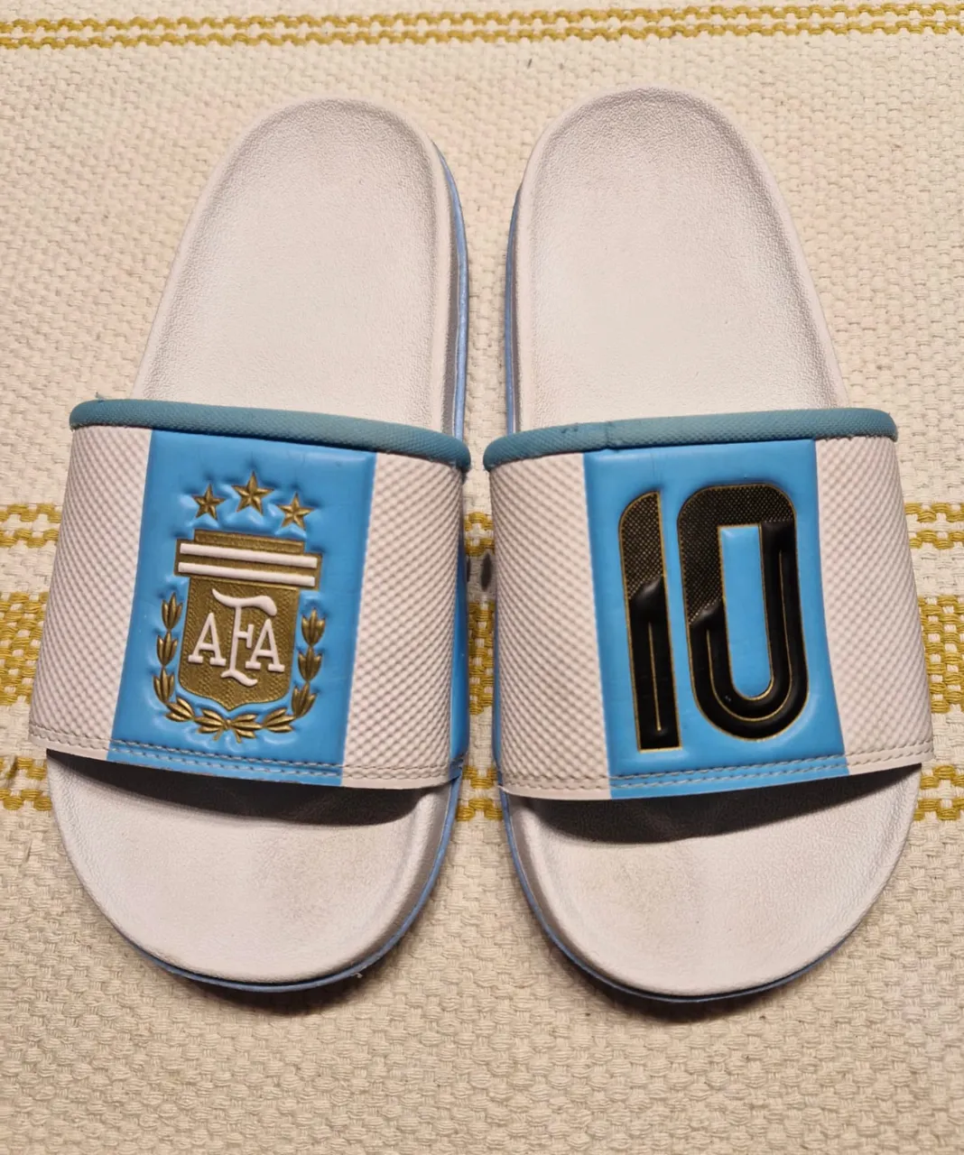 Ojotas súper cómodas y cancheras. Tienen un diseño inspirado en la Selección Argentina de fútbol, con los colores celeste y blanco y el escudo de la AFA en una de las tiras y el número 10 está estampado en la otra tira. Talle 38/39. Suela y base de PVC, tira de textil sintético.