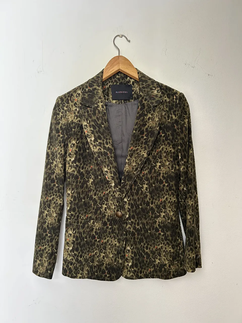 Blazer estampado con diseño animal print en tonos verdes y detalles en naranja. Posee un solo botón al frente y bolsillos laterales.
