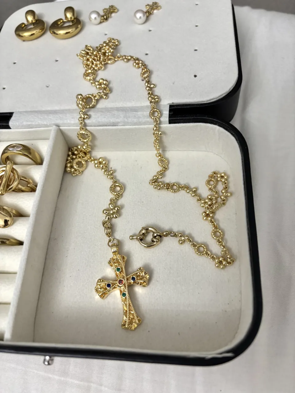 Collar de cruz con detalles en rojo, azul y verde