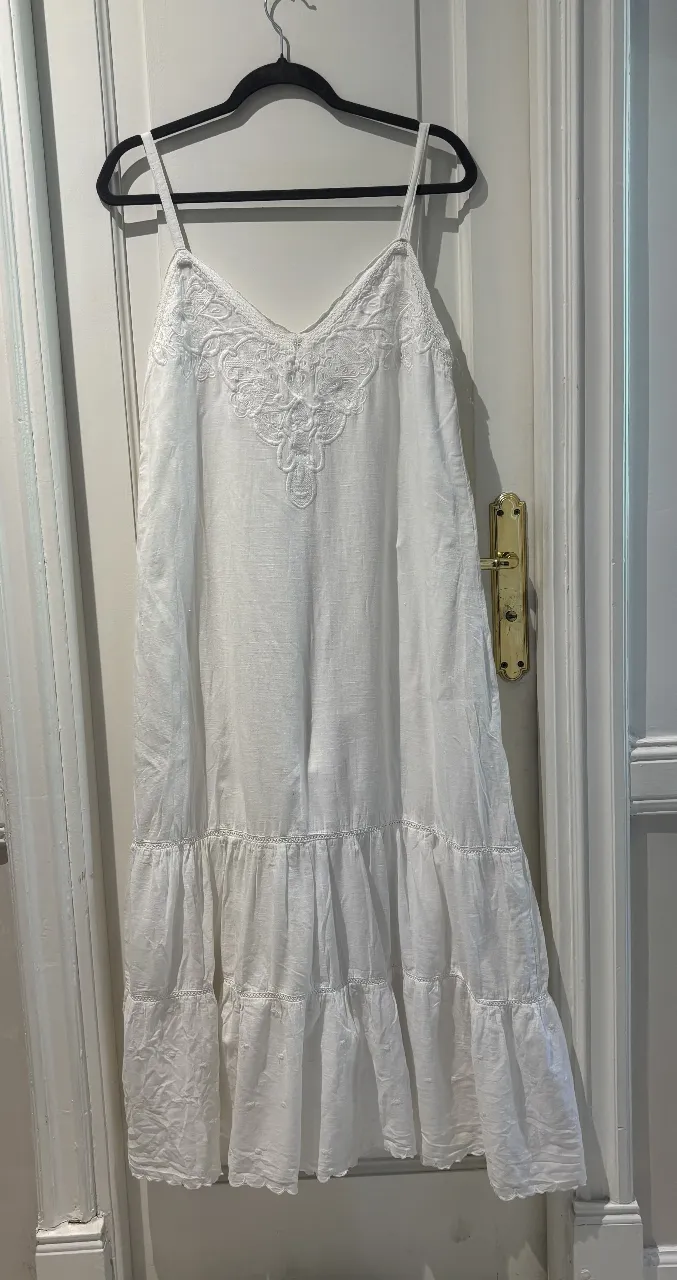 Vestido blanco largo con tiras finas y detalles de bordado y encaje en el escote y en los ruedos. Ideal para un look fresco y bohemio.