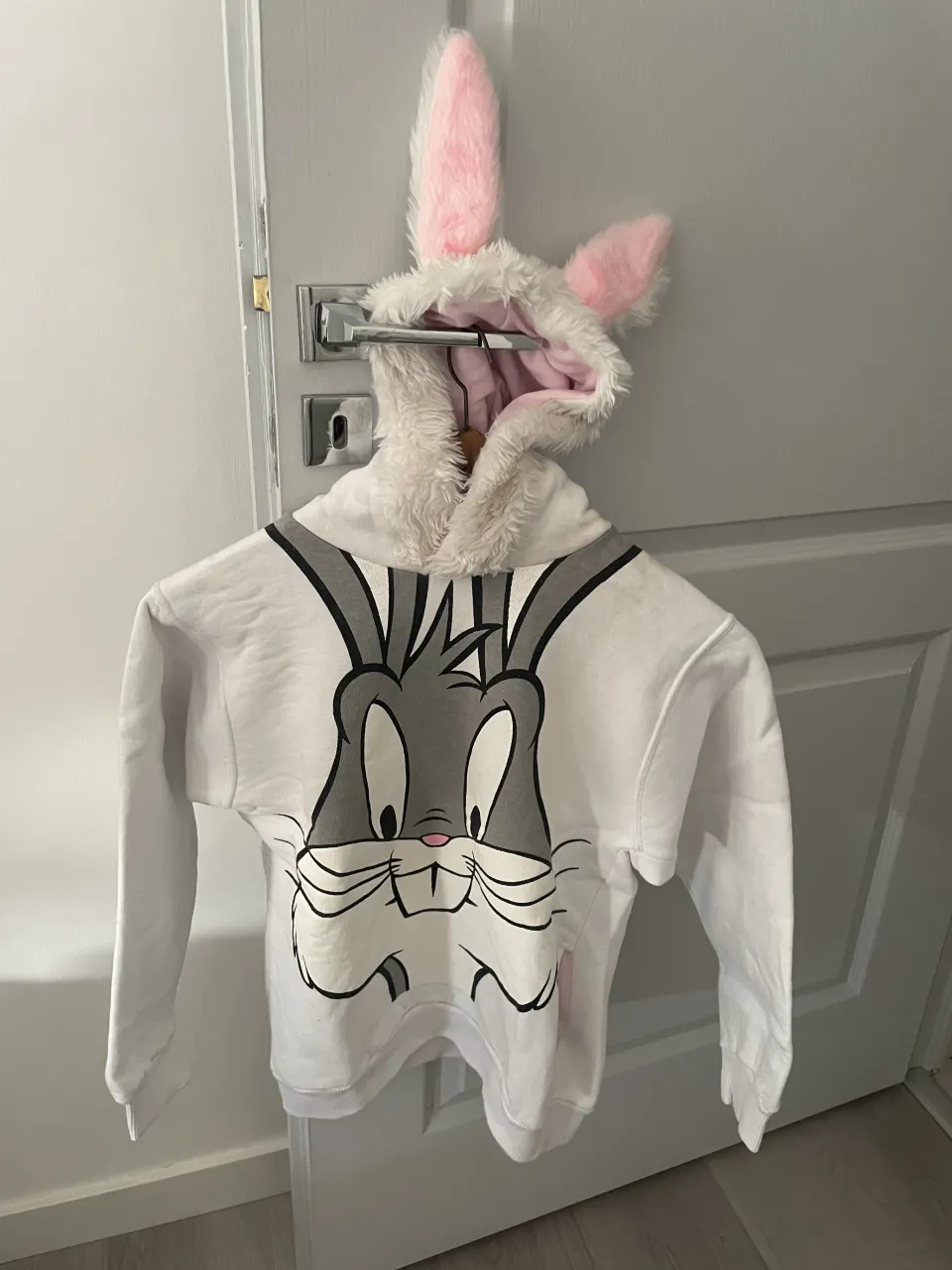 Buzo blanco con capucha de Bugs Bunny estampado en el frente. La capucha tiene orejas de conejo con peluche rosa y blanco.