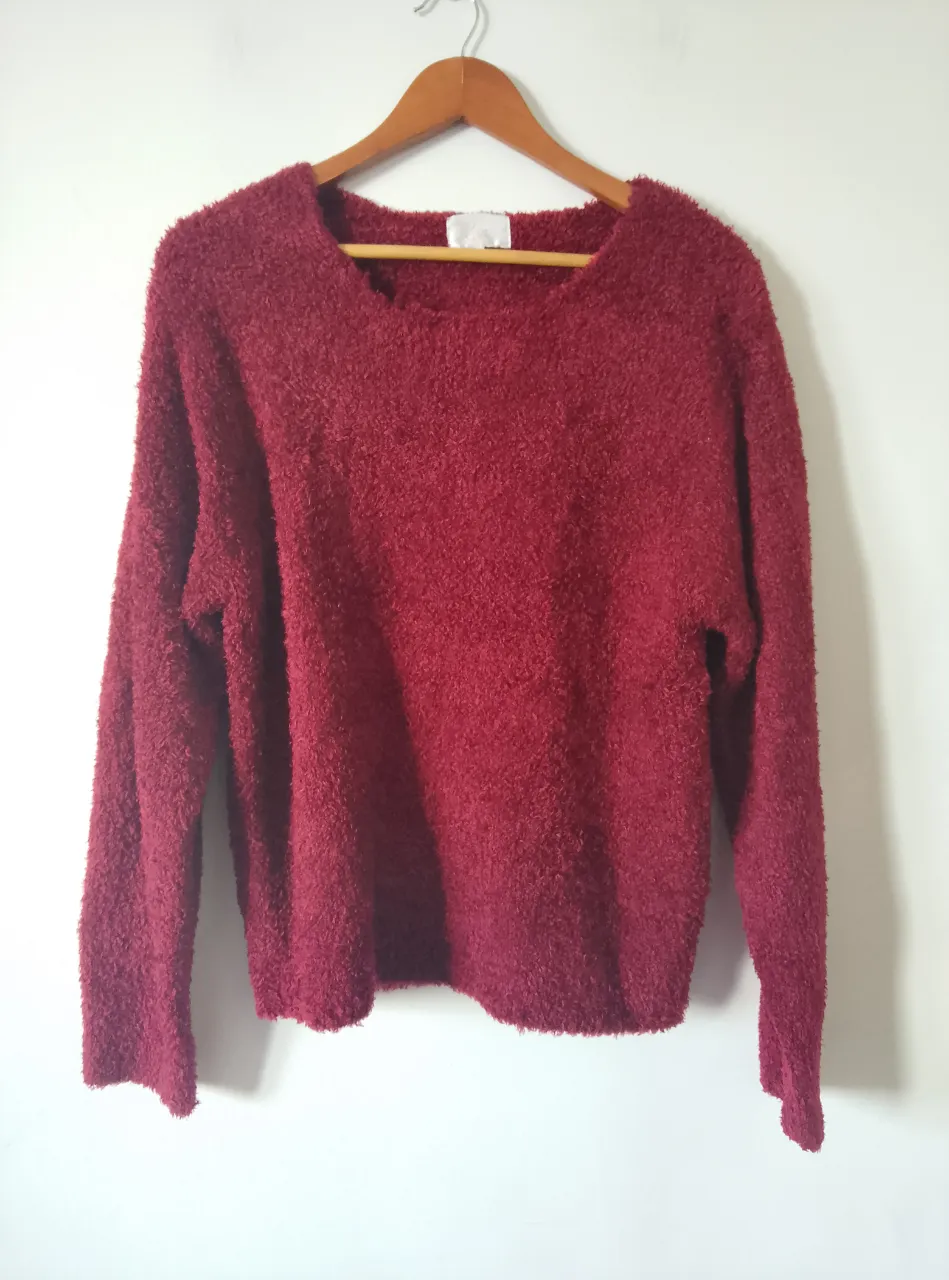 Sweater rojo polar (posiblemente talle large por el tamaño). Tela elastizada y de peluchito. Color bordó. Hermoso y calentito para cualquier uso.