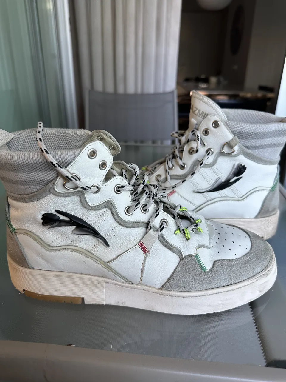 Zapatillas Jazmin Chebar, urbanas altas de cuero blanco con detalles en gris y negro. Cordones blancos y negros con detalles fluorescentes. Suela de goma blanca.