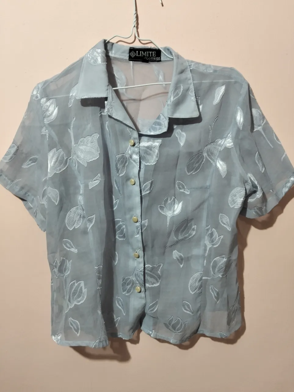 Remera de seda gris con estampado floral en relieve. Manga corta y cuello camisero. Ideal para un look elegante y delicado.