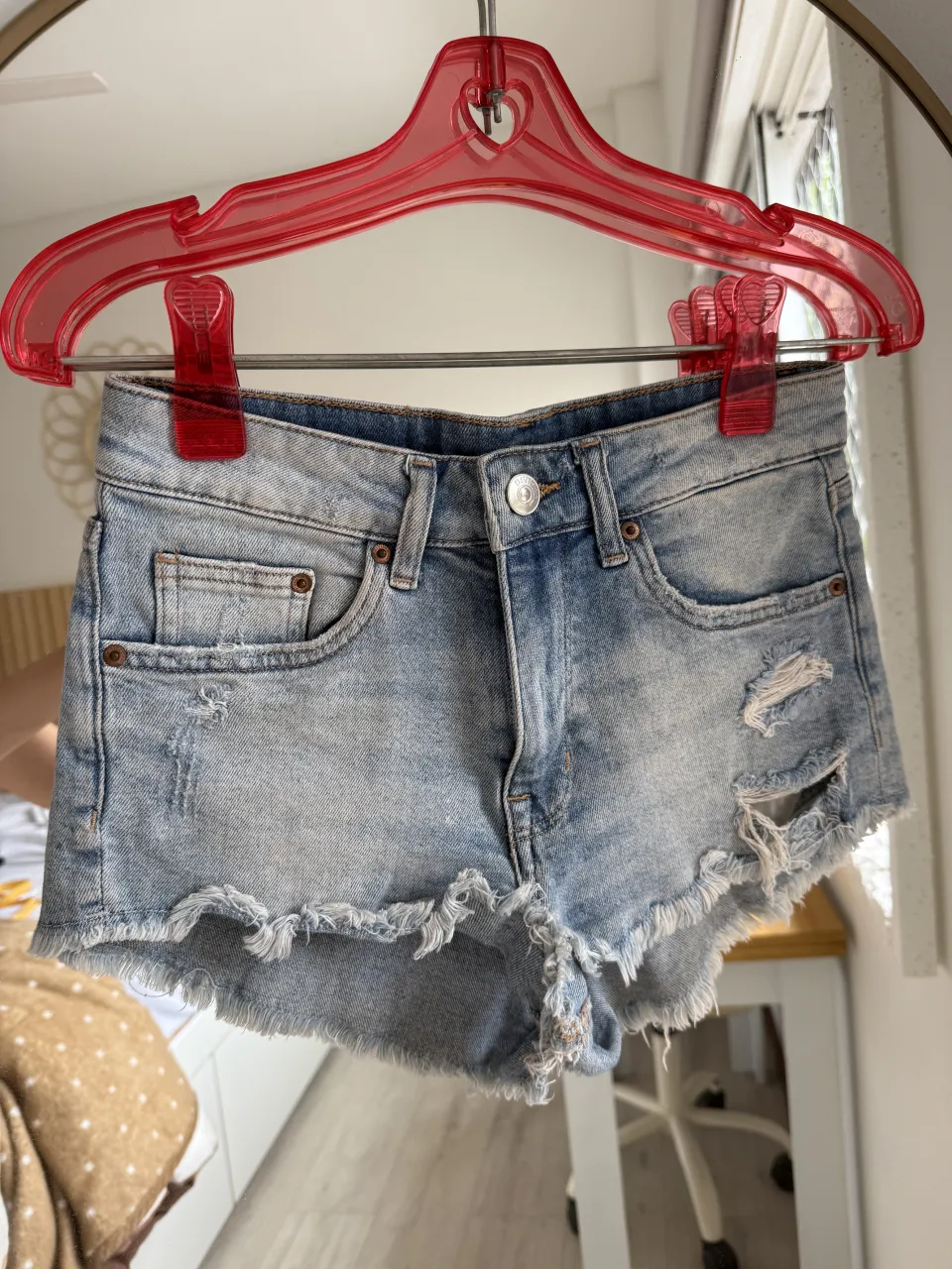 Shorts de jean tiro alto, con roturas y detalles desflecados en el borde inferior. Lavado celeste desgastado. Perfectos para un look casual y canchero. medidas: tiro 25cm cintura 33cm