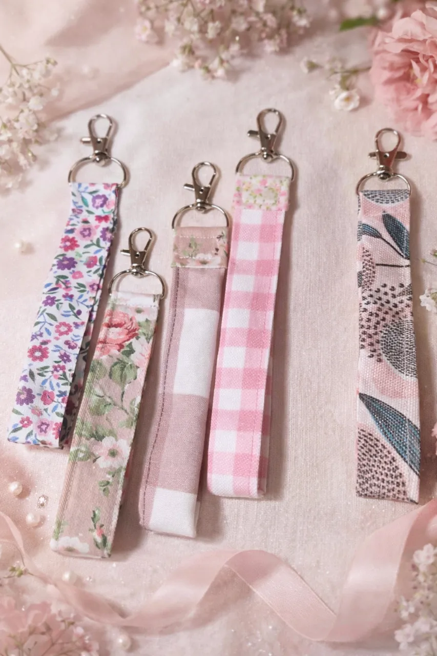 Llaveros artesanales con diseños florales y a cuadros en tonos pastel. Perfectos para darle un toque tierno y delicado a tus llaves o cartera.