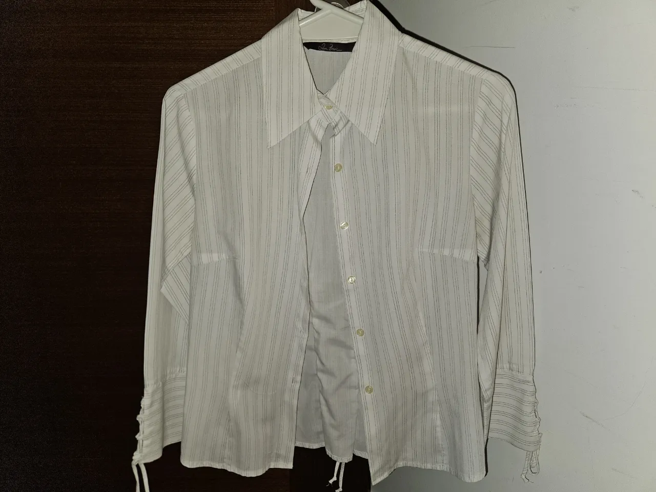 Camisa blanca de manga larga con finas rayas verticales grises. Posee un diseño único en la espalda con cordones entrelazados que permiten ajustar la prenda. Los puños también tienen un detalle de cordones.