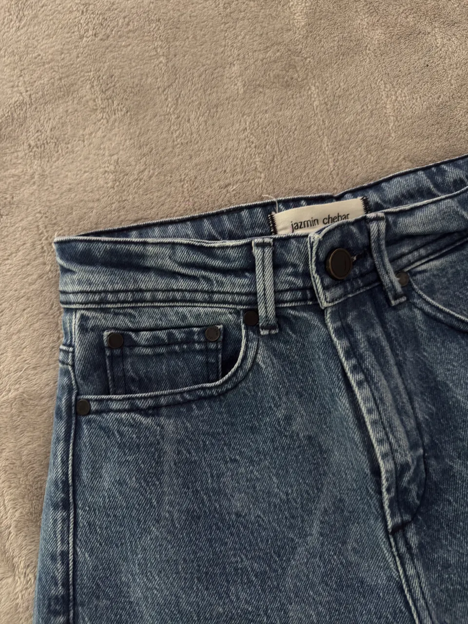 Jeans tiro alto, corte recto, color azul clásico. Un básico indispensable para cualquier guardarropas, súper versátil y cómodo para el día a día.